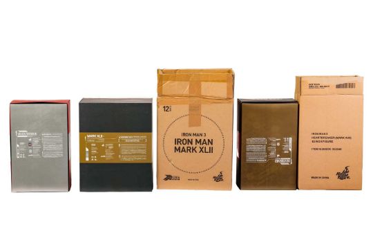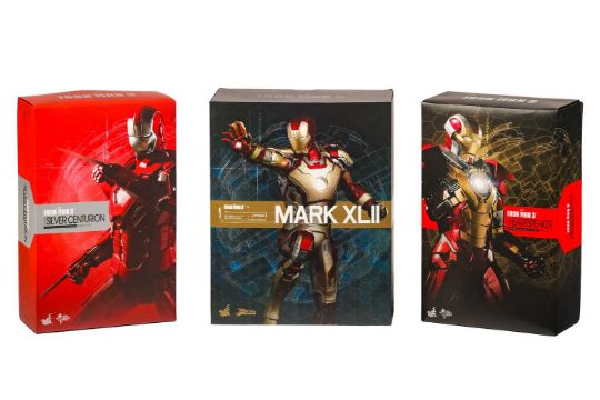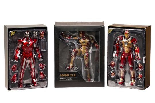 Hot Toys Iron Man 3 Silver Centurion 1:6 scale collectible figure, MMS213, in original box, together with Iron Man 3 Heartbreaker Mark XVII 1:6 scale collectible figure, MMS212, missing the pole for the stand, in original box with outer carton, and a Iron Man 3 Mark XLII 1:6 scale collectible figure, PPS001, in original box with outer carton, the largest measure 38.5 cm x 29.5 cm x 18 cm