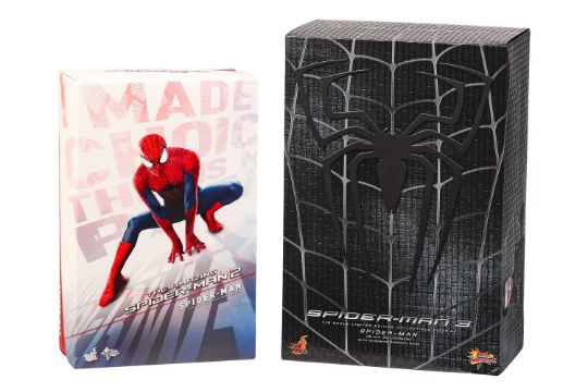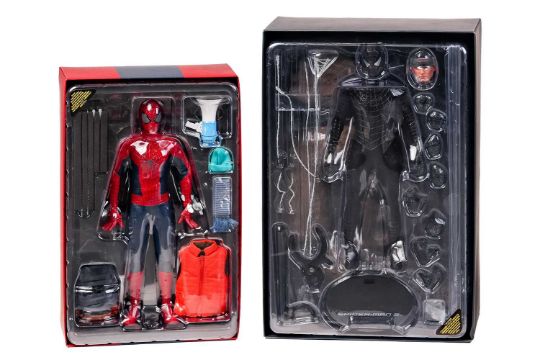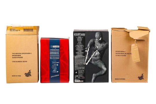 Two Hot Toys 1:6 scale collectible figures, 'The Amazing Spider-Man 2', MMS 244, together with a 'Spider-Man 3 Limited Edition Black Suit Version with Sandman Diorama Base', MMS165, each in original outer carton.