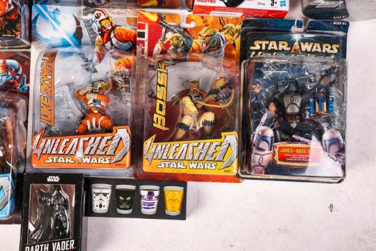 Hasbro Unleashed Yoda (6235540000), Unleashed Han Solo (6235550000), Unleashed Han Solo (655180000), Unleashed Aayla Secura (6308650000), Unleashed Obi-Wan Kenobi (6131891200), Unleashed Luke Skywalker (6293680000), Unleashed Bossk (6308670000), Unleashed Darth Maul (6131890100), Unleashed Jango & Boba Fett (0202 84806/84807 265), Unleashed Aurra Sing (6386870000), Unleashed Shadow Stormtrooper (6571250700), Bladez Toys Radio Control Inflatable R2-D2, Hasbro Star Wars Missiob Fleet Darth Vader, Disney Micro Galaxy Squadron Millennium Falcon #0022, Disney Toothpick Holders, Darth Vader in a Box, Hasbro Star Wars Galactic Heroes Darth Vader and Star Wars Masterpiece Edition C-3P0 Tales of the Golden Droid