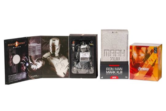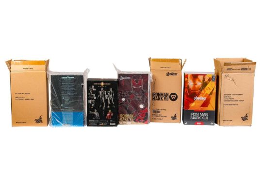 Hot Toys, Iron Man Mark II, MMS78, in original box, together with Sideshow Iron Man Mark III 1:6 scale collectible figure, MMS314-D12, sealed in original box with original carton, Sideshow Iron Man Mark XLIII 1:6 scale collectible figure, MMS278D09, in original box with original carton, and Hot Toys Iron Man Mark VII 1:6 scale collectible figure, MMS500-D27, sealed in original bag with original outer carton, largest measures 43 cm x 24 cm x 17 cm