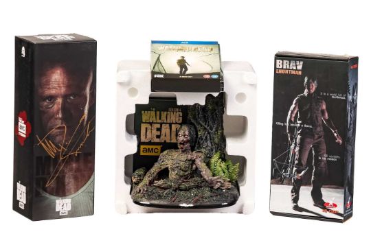 Threezero, The Walking Dead Merle Dixon 1:6 scale collectible figure, 3Z0014, outer box autographed by Michael Rooker, together with a McFarlane Toys The Walking Dead Tree Walker DVD Case and Blu-ray DVD collection, 14449, and Ourworld Daryl Dixon accessories pack, all in original packaging, Merle Dixon figure is sealed and appears unopened