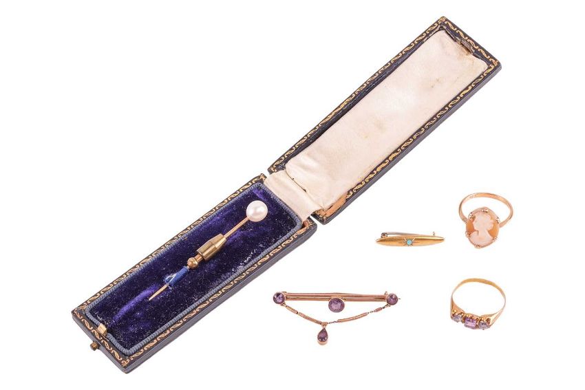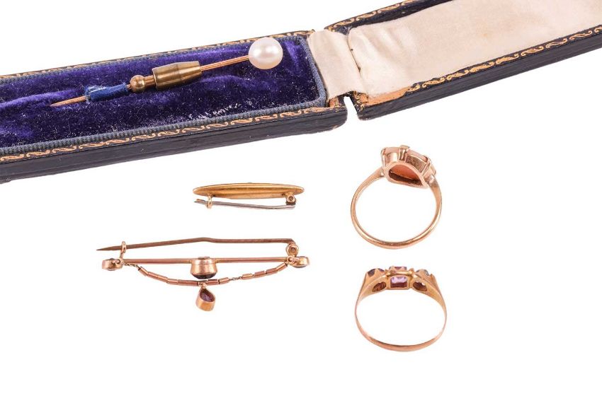 A pearl stick pin, gem-set rings and brooches; the stick pin set with a 7.15 mm white pearl, pin surface testing as 14ct, togther with a turquoise-set bar brooch in yellow metal stamped "14k"; a hardstone cameo ring, stamped "9k" and a quartz-set ring in yellow metal and an amethyst-set bar brooch both in yellow metal surface testing as 9ct, total weight of items 10.45 grams (5).
