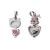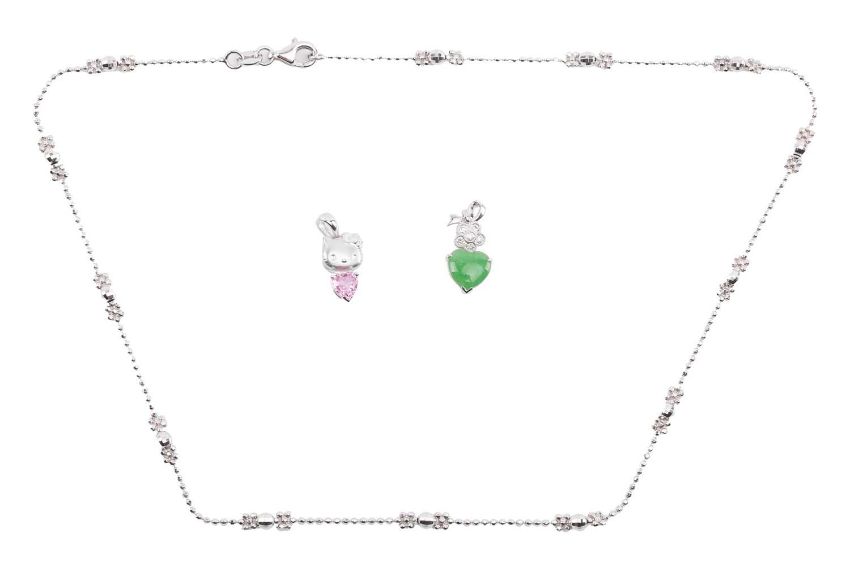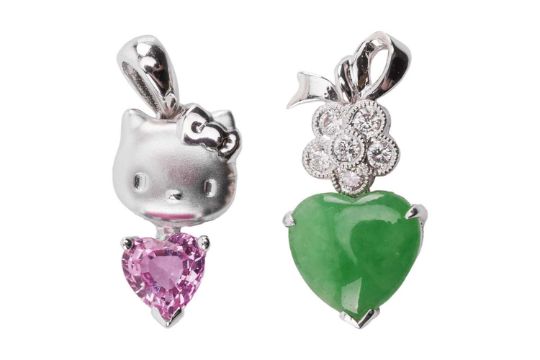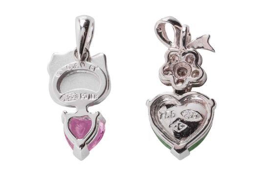 Two Chow Sang Sang heart-shaped pendants and a fancy link chain; first to include a heart-cut pink sapphire claw-set to a sandblasted Hello Kitty surmount, white metal stamped '18K' with maker's mark, 1.9 cm drop, in original case; an apple green jadeite heart cabochon claw-set to a flowerhead surmount, brilliant-cut diamonds in collet with millgrain details, bow-shaped bail, white metal marked '750', 1.9 cm drop; and a fancy ball link chain, with faceted beaded stations, in white metal marked '750', overall length 40.0 cm; Total weight of items 8.6 grams. (3)