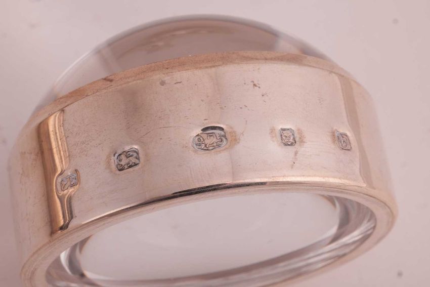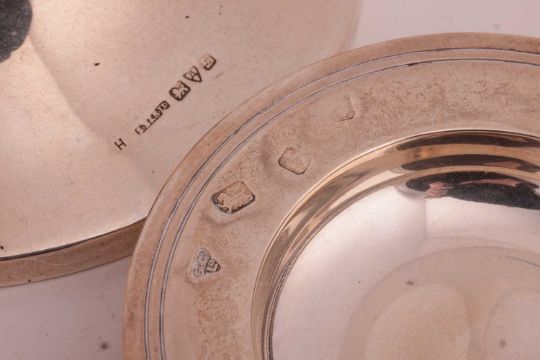 A small collection of silver items comprising an early 20th Century quaich, hallmarked Glasgow 1910, a fluted tea caddy, with hinged cover and ebonised finial, an ink well with filled base, pin dish and magnifying glass; 13.7ozt (427.2 grams) (5)