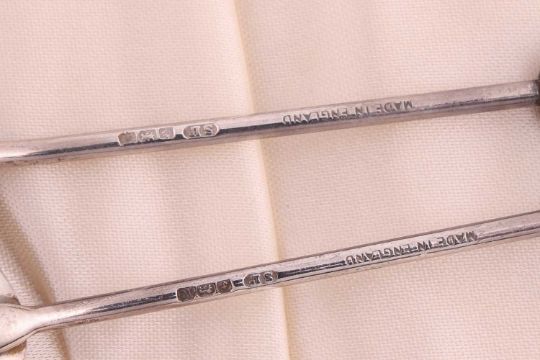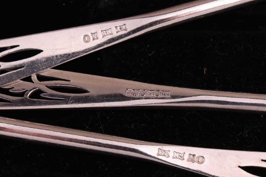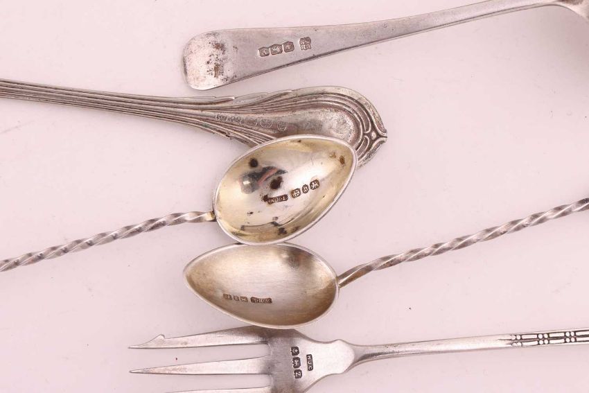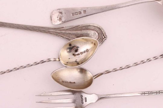 A small group of mixed items comprising a boxed case of silver coffee spoons, two pierced silver bon bon dishes, a set of six silver apostle spoons, three silver napkin holders, a silver pickle fork, a silver toddy ladle and other items including a silver plate fish server and cake slice; 11.27 ozt (350.6 grams)