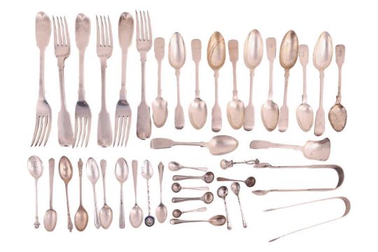 A set of six Victorian fiddle pattern table forks, monograms engraved to terminals. London 1859 and 1860 by Hyam Hyams, together with two pairs of silver sugar tongs and a quantity of teaspoons and other flatware. Gross weight weighable 981g (31.5ozt)
