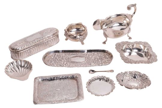 A small collection of ornated silver items; to include a sauceboat with scrolled handle on hoofed feet, London 1900; a shell butter dish on ball feet, Sheffield 1914; a Victorian quatrefoil dish of floral and mask design, London 1892; and a Victorian cauldron salt by George Angell & Co.; other repousse dressing table dishes; a Continental import silver dish; and a plated condiment spoon marked 'England'; Total weighable 941.0 grams (30.25 ozt).