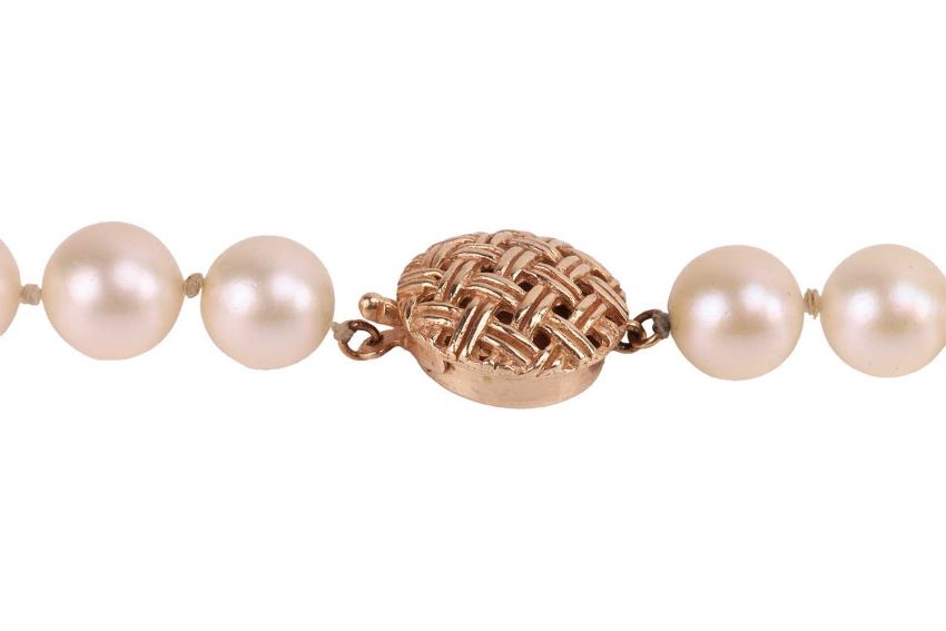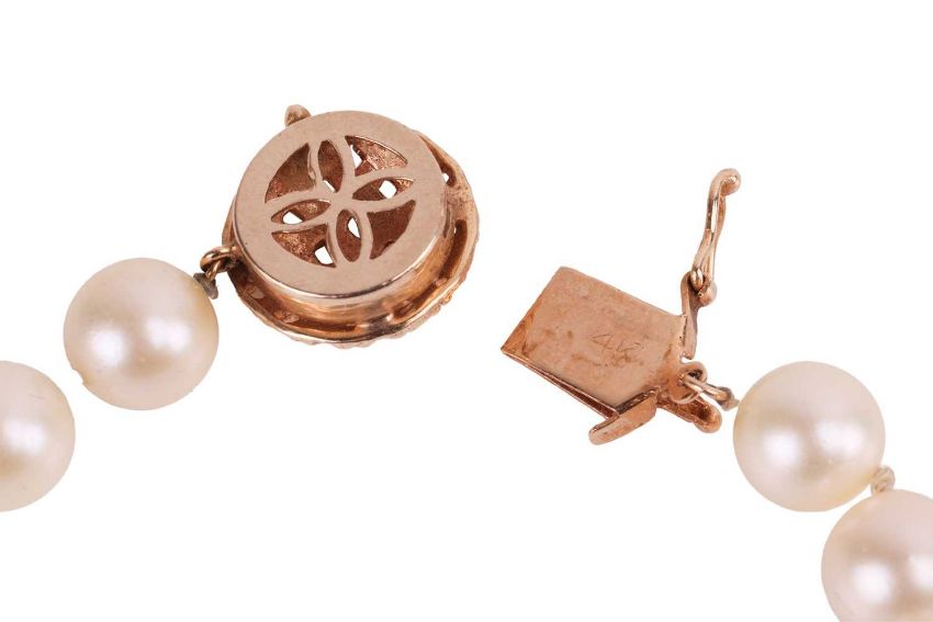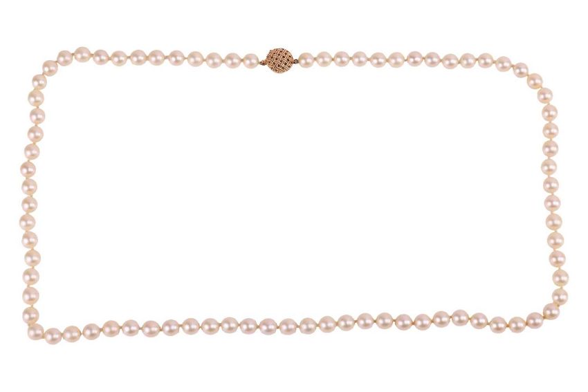 A single strand cultured pearl necklace; featuring round cultured Akoya pearls of cream body colour with subtle silver-pink lustre, measuring approximately 8.0 - 8.25mm each, individually knotted, to a rounded clasp with basket-weave design and tongue clasp, in unmarked yellow metal stamped "14k", length 77.0cm