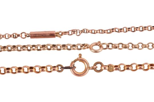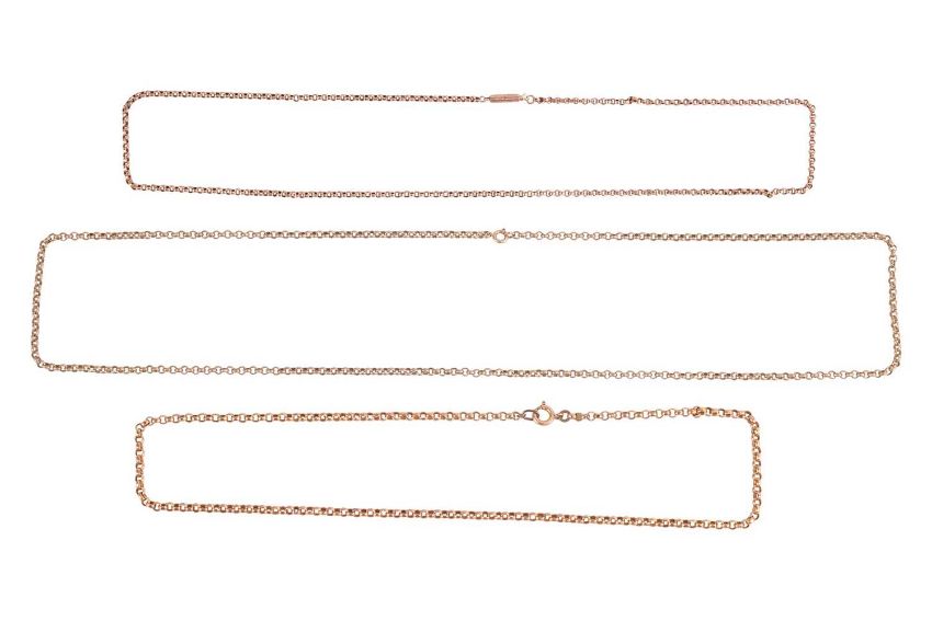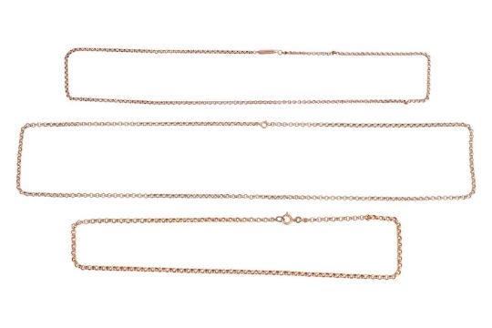 A group of three belcher chains and a ring mount; the first belcher chain surface testing as 9ct, measuring 48.5cm, completed with a tube box clasp; the second belcher chain surface testing as 9ct, measuring 61.0cm, completed with a spring ring clasp; the third belcher chain surface testing as 14ct, measuring 43.5cm, completed with a spring ring clasp; the ring mount of abstract design, surface tested as 18ct; Total Weight of items 31.5 grams (4)