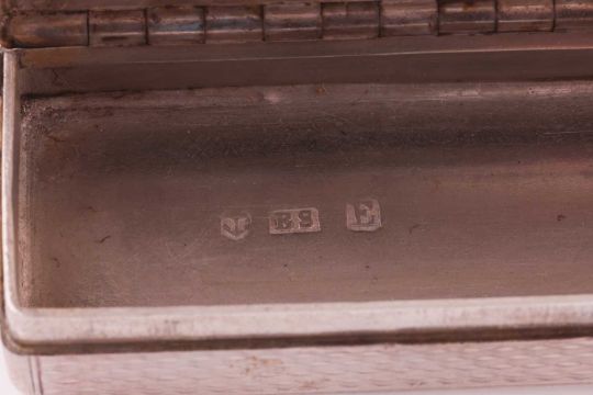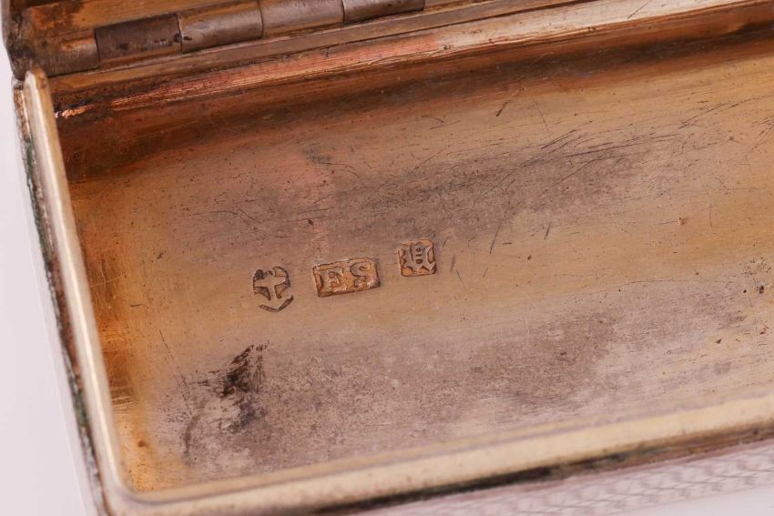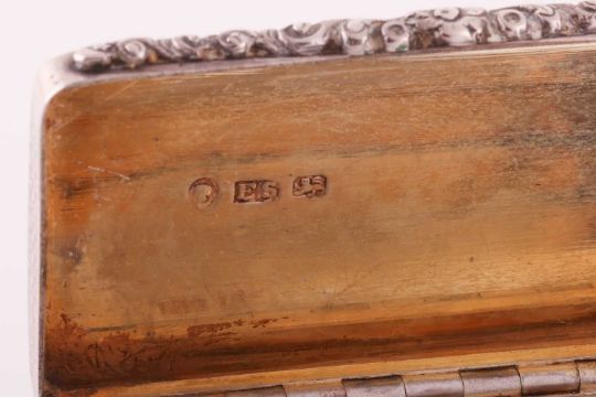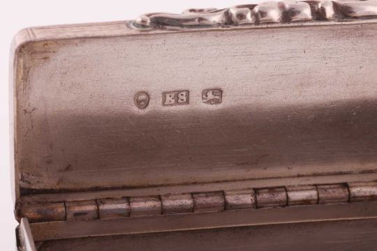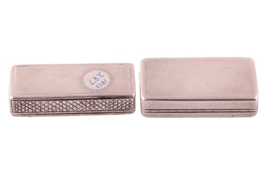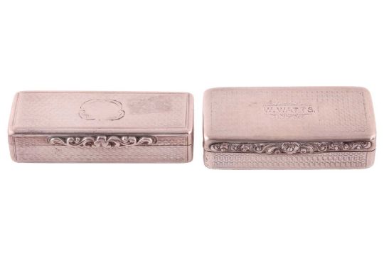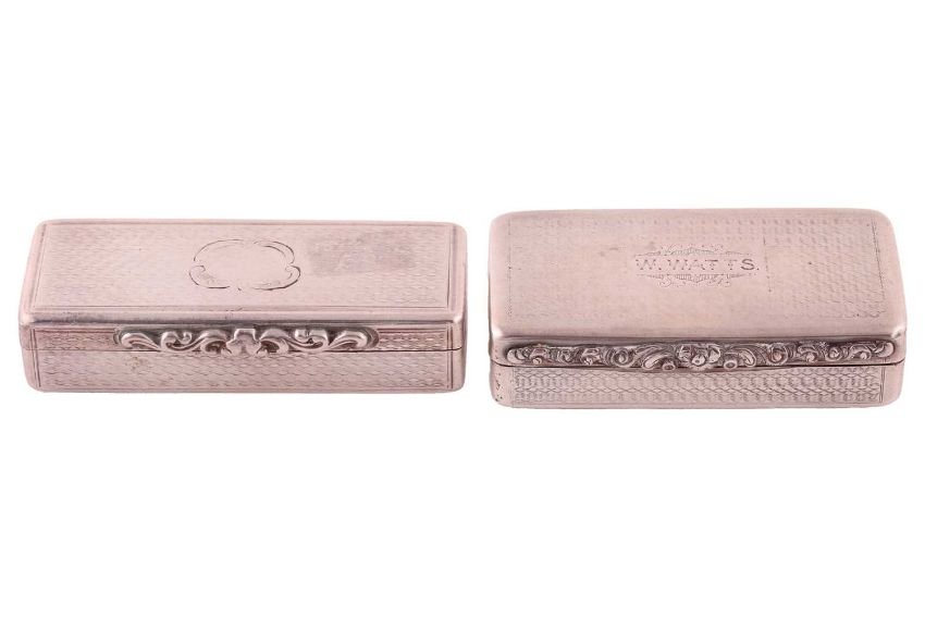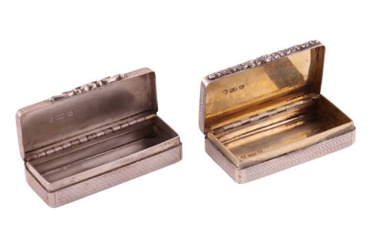 Two Victorian silver snuff boxes by Edward Smith; both of elongated rectangular form and covered with engine-turned patterns; one engraved with initials on cover, with floral thumbpiece and gilt interior, Birmingham 1844, 6.3 cm wide; and another similar with empty cartouche, Birmingham 1853, 6.7 cm; Total weight of items 106.5 grams. (2)