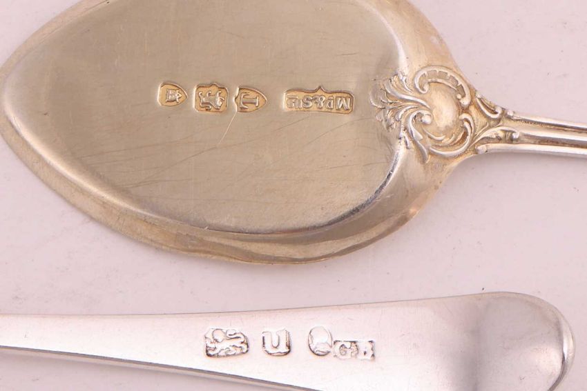 A set of six George III teaspoons, with bright-cut handles and terminals, together with a set of six ice cream spoons, with gilt bowls leading to pierced terminals of floral design, hallmarked London, 1894; 149.1 grams (4.97ozt).