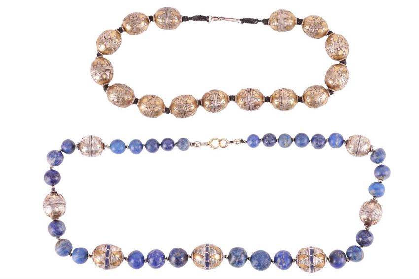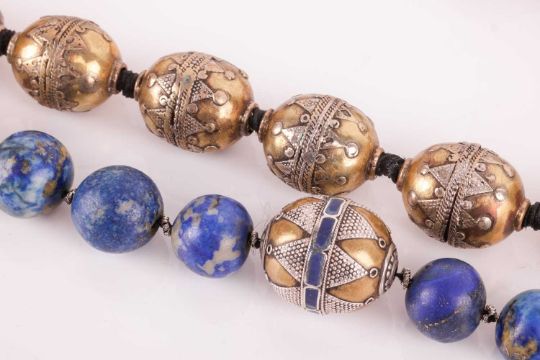 Two ethnic beaded necklaces; to include a single row of graduated round lapis lazuli beads, interspaced with Turkoman/Kazakh enamel beads, 72.5 cm; another similar with a row of Turkoman/Kazakh brass beads, S-hook clasp fastening, 51.0 cm long. (2)