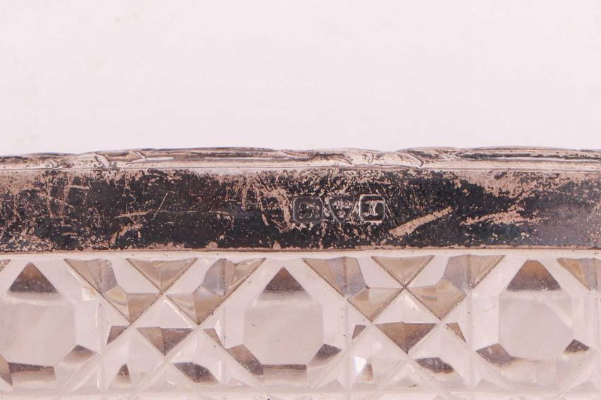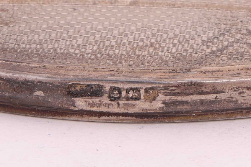 A mixed group of items comprising a silver George III fiddle pattern soup ladle, a pair of silver sugar nips, a silver George III tablespoon, an engine-turned silver-backed hand mirror, a glass dressing table jar with silver cover, a silver vesta case, a silver decanter label, and other white metal items, one marked 'silver'; 322.8grams (10.3 ozt)