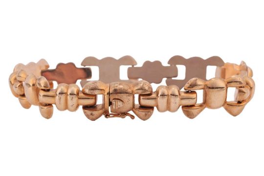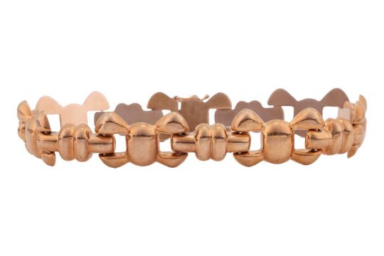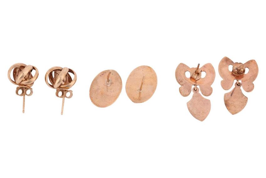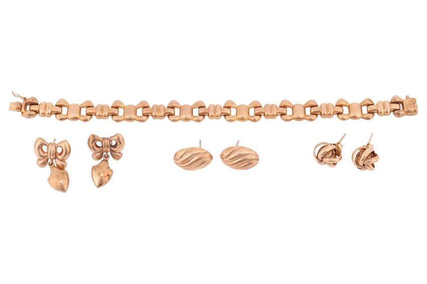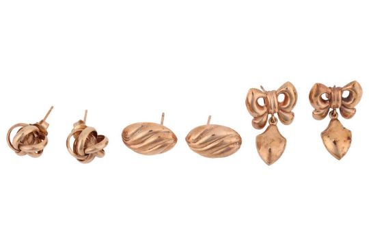 Three pairs of yellow metal earrings and a bracelet; comprising a pair of bow earrings with a drop of shield form, in yellow metal surface tested as 14ct over 9ct, post fittings with butterfly backs, a second pair of earrings of stylised knot form, surface tested as 9ct, post fittings with butterfly backs, the final pair of earrings of oval form with wave design, post fittings featuring British hallmarks for 9ct gold, the yellow metal bracelet comprising of a series of stylised bow links, inner circumference 17.5cm, yellow metal surface tested as 9ct, completed with an integral box clasp and additional safety clasp; Gross weight 17.9 grams (4).