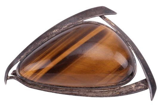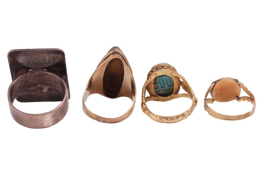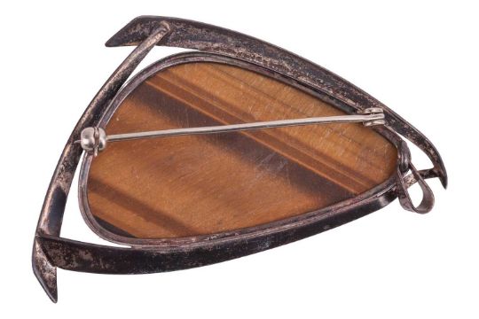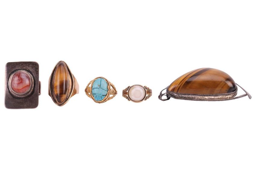 A collection of four gem-set rings and a brooch, one of yellow metal set with a tiger's eye, stamped 9ct; another set with turquoise scarab to a yellow metal mount, surface testing as 14ct, and another set with a white hardstone, in yellow metal surface testing as 14ct; a silver ring set with an agate; together with a white metal tiger's eye brooch; ring sizes J-O 1/2, brooch width 5.3cm, total weight 43.89grs (5).