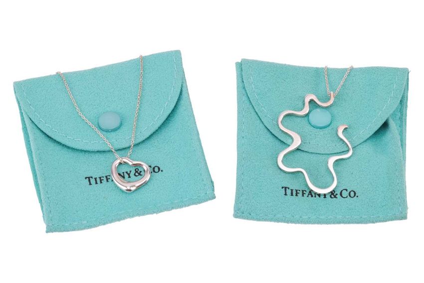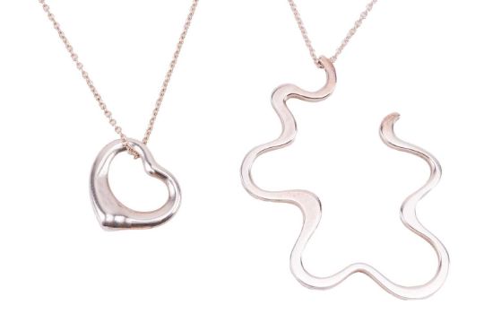 Tiffany & Co. - a pendant necklace by Frank Gehry and an 'Open Heart' pendant necklace by Elsa Peretti; the undulating openwork pendant and open heart pendant both suspended from cable-link chains with spring-ring clasp, both signed and stamped 925, pendant lengths 4.3cm and 1.2cm, total weight of items: 8.1 grams (2).