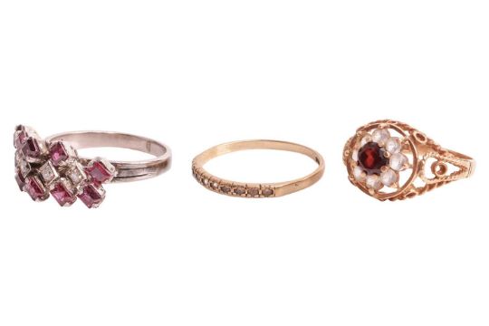 A collection of three rings; comprising a colourless gem-set ring, with UK hallmarks for 9ct gold; a paste cluster ring, with Birmingham hallmarks for 9ct gold, and a synthetic ruby and diamond dress ring, stamped with Lion mark and "18K", ring sizes K 1/2 - P, total weight 7.95 grams (3).