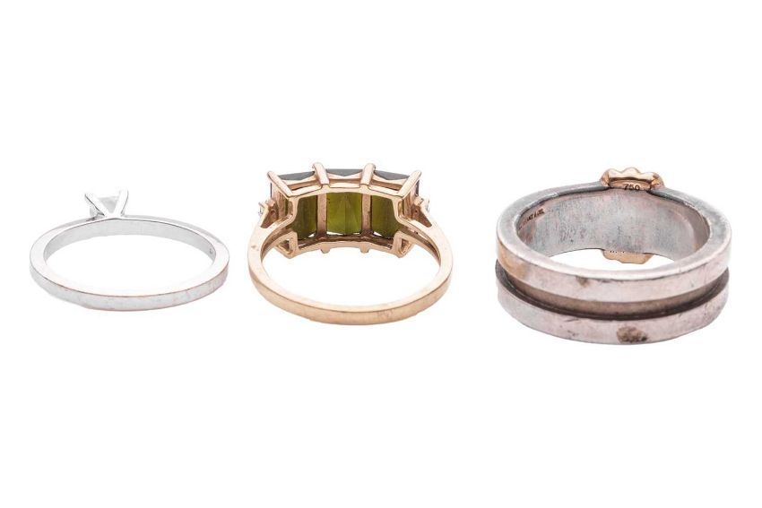 A group of three rings; to include a solitaire, set with a 0.25ct princess cut natural diamond, to an 18ct white gold band with London hallmarks, size M, 2.3g; a 9ct trilogy ring set with three rectangular green tourmalines, with diamond accents to shoulders, set in yellow gold with British hallmarks, size N 1/2, 2.8g; and a Tiffany "Atlas Groove" ring signed and stamped "925" with a yellow metal banded detail stamped "750", size Q, 9.9g.