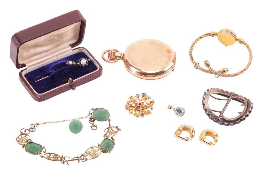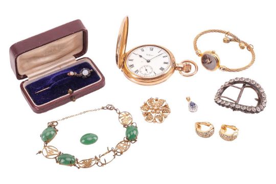 A collection of jewellery and costume jewellery; to include an opal, emerald and diamond stick pin, the diamond approximately 0.20ct, in yellow metal surface tested as 9ct together with a Waltham pocket watch, a seed pearl flower brooch, a Gucci watch and an aventurine quartz bracelet (one stone deficient) and other items, total weight 171.51 grams (7).