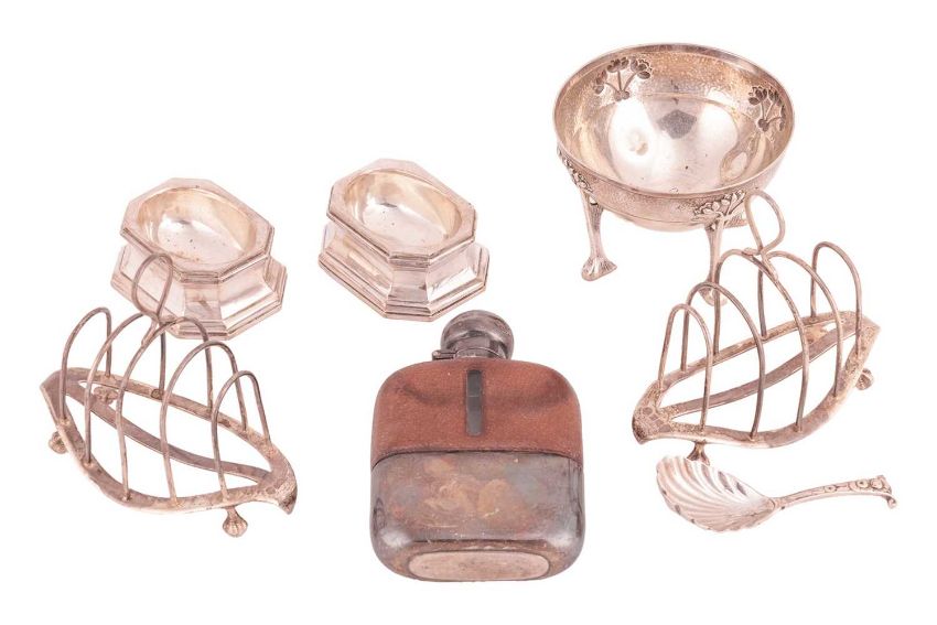 A mixed collection of silver items comprising a pair of silver toast racks, Sheffield, 1913, an Edwardian Arts & Crafts bon bon dish, a pair of silver salts, a Victorian caddy shell spoon and a silver and leather hip flask, 541.4 grams (17.4 ozt)