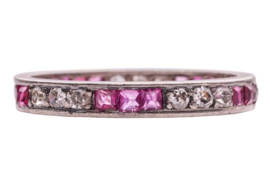 A diamond and ruby eternity ring, composed of alternating segments of synthetic rubies and single-cut diamonds in a channel setting, to a flat-edged band, size K½, 1.7 grams.