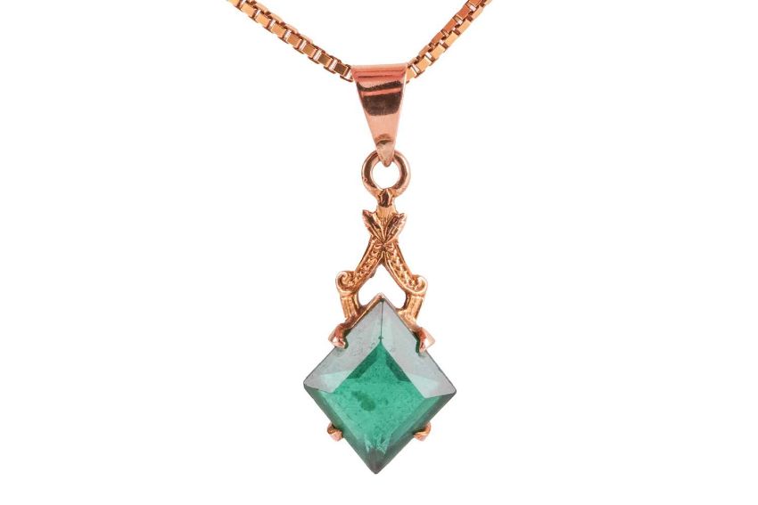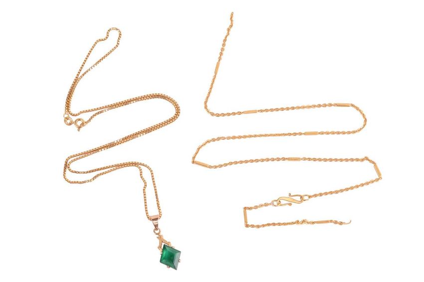 A paste-set pendant necklace and a chain; the green rhomboid pendant to a cross surmount and tapered suspensory loop stamped "9ct", suspended from a box-link chain with spring-ring clasp stamped "750", length 55cm; together with a fancy cable and bar-link chain with shepherd's hook (broken), surface tested as 22ct, length 44.6cm. Total weight 14.81 grams (2).