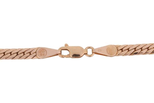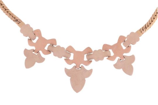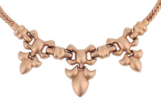 A 9ct gold necklace, featuring a central segment of stylised bow links with drops of shield form to a flattened curb link chain, terminated with two pear-shaped loops with London hallmarks for 9ct gold, completed with a lobster clasp, approximately 43.0cm in length, 11.7 grams.