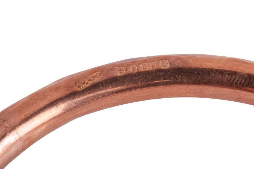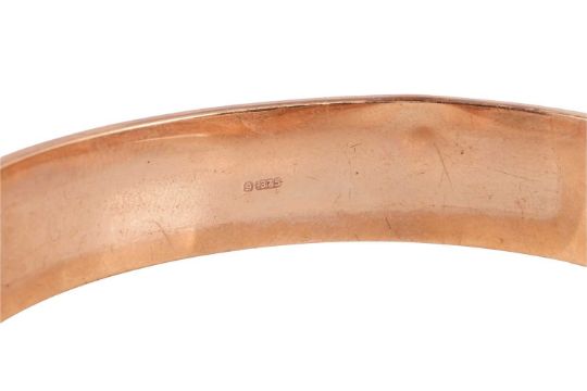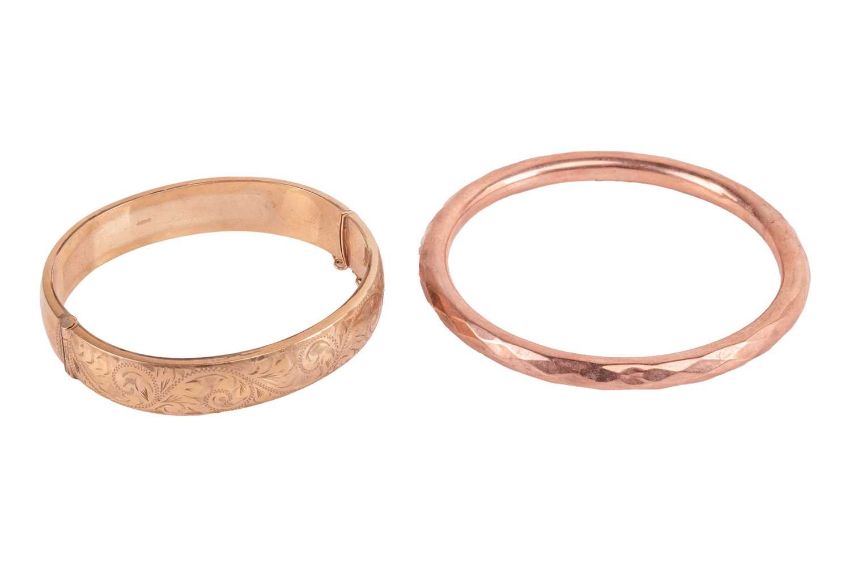 A hinged oval bangle with scrollwork detailing, hallmarked 9ct gold, Birmingham, 1965, together with a 9ct rose gold circular closed bangle with faceted surface, hallmarked Chester, 1926; 27.8 grams (2)