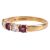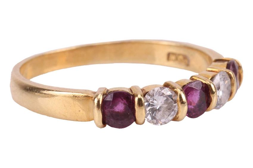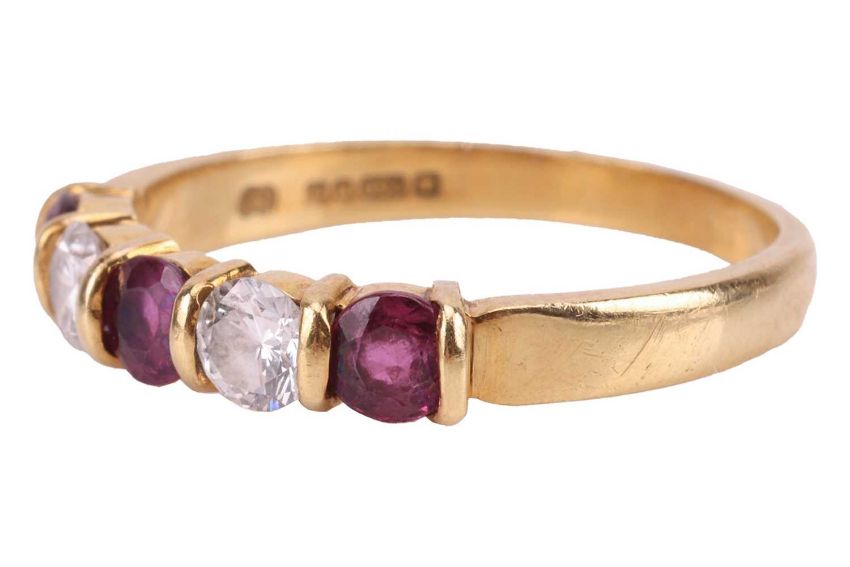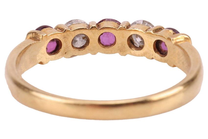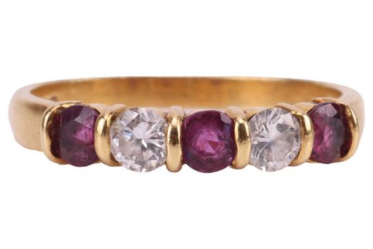 A ruby and diamond-set half-eternity ring, with two round brilliant diamonds and three round-cut rubies, alternating in semi-bezel settings, in an 18ct yellow gold mount, size M; 2.4 grams