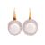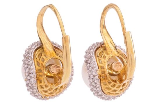 A pair of pearl and earrings; each featuring a central cultured akoya pearl of approximately 8.5mm, of cream hue with pink and green lustre, set within an undulating halo of rounded form, pave-set with cubic zirconia, to shepherds hook "front-to-back" ear wires in yellow metal stamped '750' with Italian convention marks, drop 2cm, total weight 7.2 grams.
