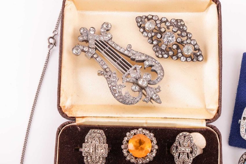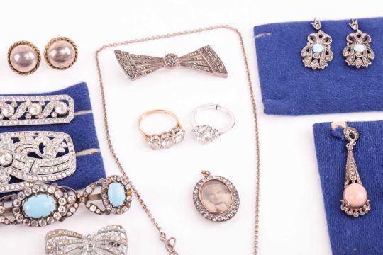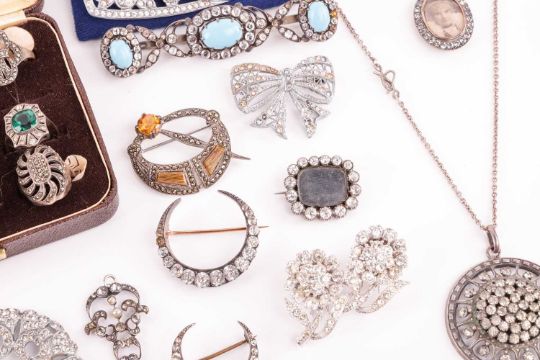 A group lot of antique paste-set jewellery, to include; various paste-set brooches, necklaces and mourning jewellery frames, a collection of antique marcasite-set earrings and rings as well as a pair of sapphire-set stud earrings, silver disc earrings and others, total weight of items 499.8 grams.