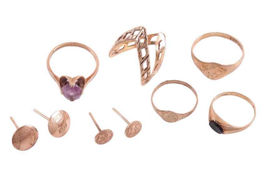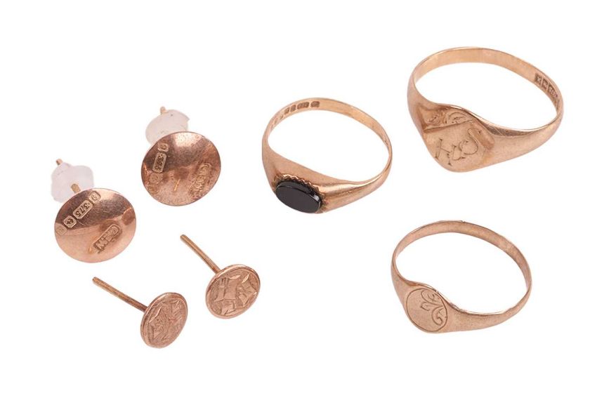 A small collection of jewellery items; comprising an amethyst ring, a wishbone ring, a pair of signet rings, an onyx ring, and a pair of button studs, all with British hallmarks for 9ct gold; together with a pair of button studs surface testing as 9ct, ring sizes G-O, total weight 10.57grs (9).