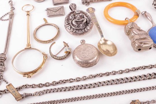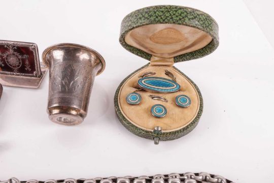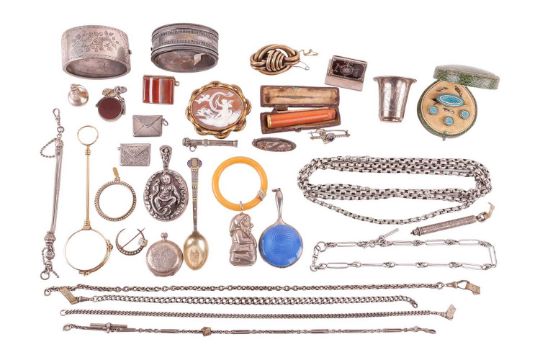 A collection of Victorian silver and silver gilt jewellery such as a blue guilloche enamel mirror, a similarly-set dress set, a banded agate charm, bangles, together with brooches and seals.