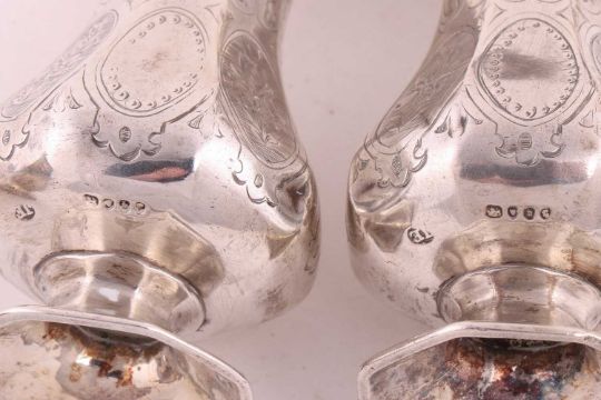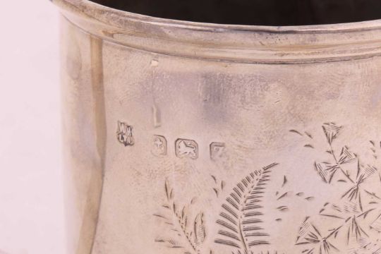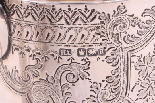 A mixed group of silver items; comprising a Victorian tankard, featuring floral and scroll detailing, with central cartouche engraved with the following: "James Edward Cunnah, 1892, From Grandma Hooton"; a George III cream jug; two Victorian pepperettes; a pair of George III salts; a conductor's baton with silver topped terminals in fitted box; condiment spoons and other items; 873.3 grams (28.0ozt).