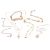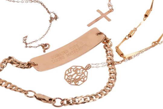 A group of chains; comprising three fine trace chain necklaces, each with C-spring clasps stamped "9ct" (one broken), one featuring a pierced work "Stop" sign pendant, another with a cross pendant also stamped "9ct"; a bracelet with elongated rectangular links, to C-spring clasp with jump ring stamped "375"; a flattened curb link medical I.D. bracelet, with lobster clasp stamped "10k" and rectangular engraved plaque featuring caduceus symbol; together with a fancy link chain necklace and a paste-set pendant both in yellow base metal; total weighable 14.0 grams.