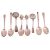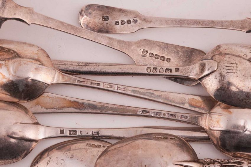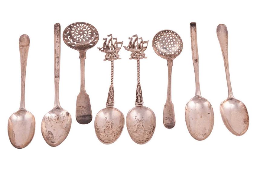 A pair of Dutch style spoons, the terminals with cast sailing boats and the bowls decorated with windmills, London 1911 by Charles Douglas Richard Hanbury-Tracy, Baron Sudeley; together with a George III marrow spoon, London 1776 by Peter and Ann Bateman; another earlier, marks obscure; a pair of Hanoverian pattern tablespoons, with scratch initials to terminals. London 1777, and two silver sifter ladles, with crest engraved to terminals. London 1810 and London 1830. Gross weight 477.5g (15.3ozt)
