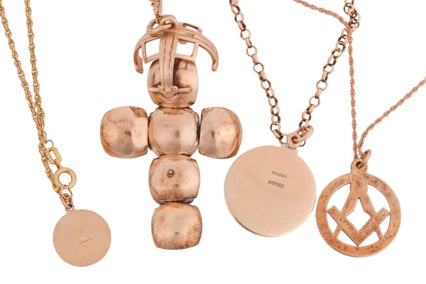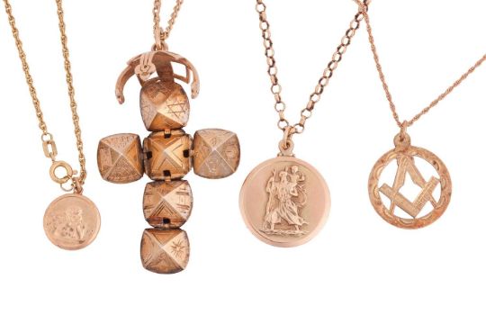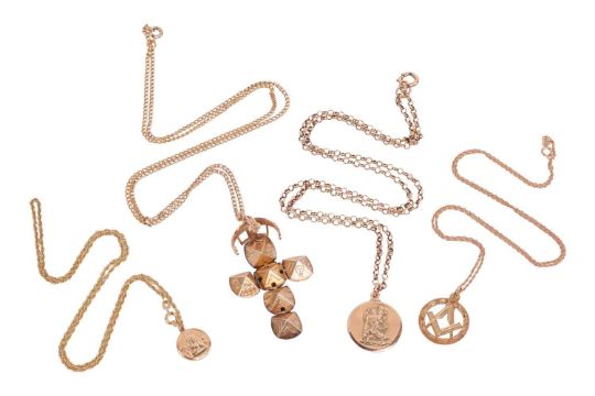 A group of pendants and chains, comprising a 9ct gold St Christopher pendant to a cable link chain surface testing as 9ct, 59.0cm in length, spring ring clasp, a 9ct gold cherub pendant to a fancy cable-link chain surface tested as base metal, a Masonic unfolding orb pendant, the orb components surface tested as base metal, the orb cover surface tested as 9ct, to a cable link chain surface tested as base metal, a Masonic pendant on chain, the pendant surface tested as base metal, the chain with a link featuring Birmingham hallmarks for 9ct gold; Gross weight of all items 34.5 grams (4).