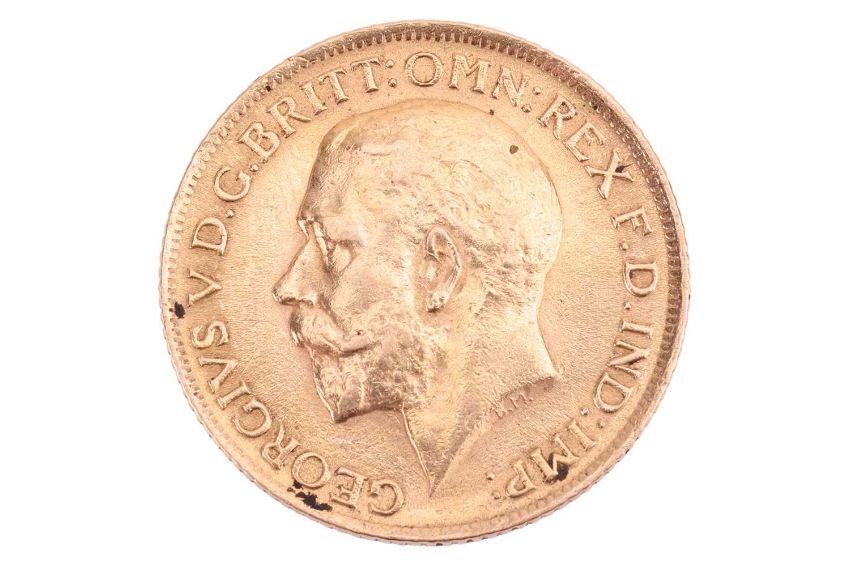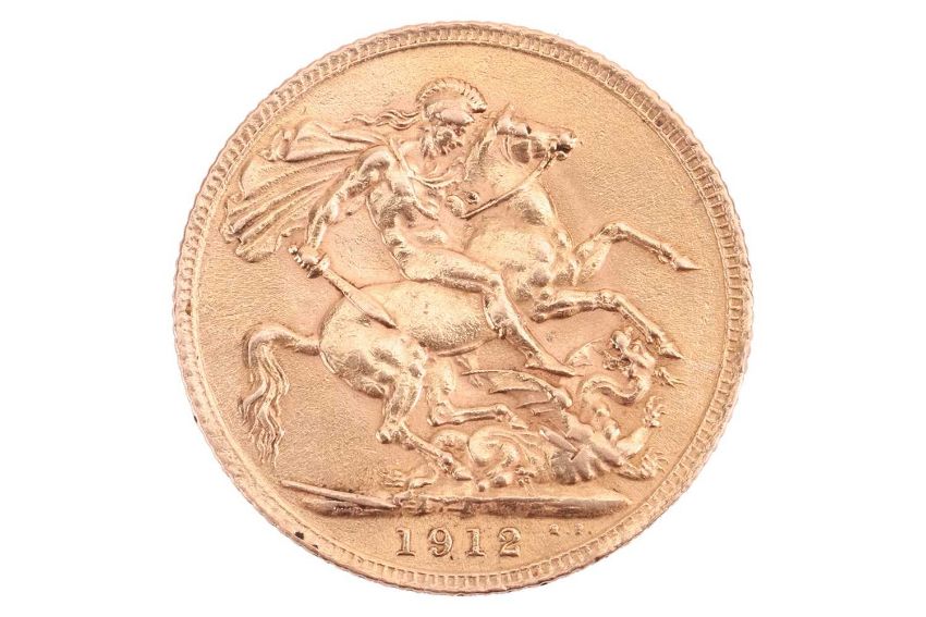A 1912 full Sovereign, featuring King George V to the obverse and the George & Dragon to the reverse, diameter 2.2cm, total weight 7.9 grams.