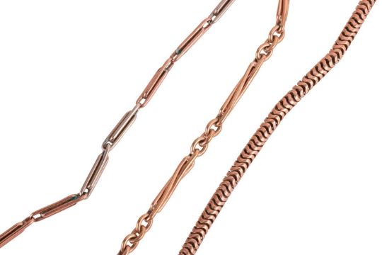 Three chains; a snake chain necklace, in unmarked pink metal, with a yellow metal C-spring clasp, surface testing as 14ct, 51cm; together with a fancy link watch chain with C-spring clasp (broken) and Albert hook in pink metal, stamped "9ct", 35.5cm; together with a bi-colour fancy link chain (broken) with C-spring clasp, in unmarked white and pink metal, surface testing as 10ct, 32.5cm; Total Weight of items 23.8 grams.
