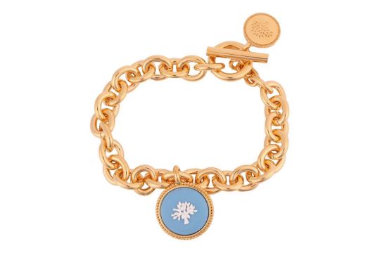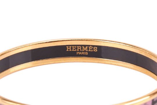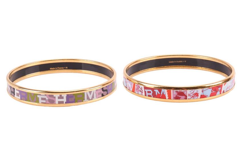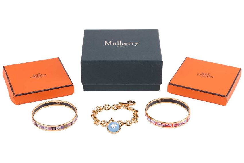 Two Hermes bangles and a Mulberry bracelet; the Hermes bangles, of closed, circular form, width approximately 9.5mm, diameter 6.5cm, in yellow metal featuring enamelled panel with multicoloured designs, black enamel panel to the inside, both signed "Hermes Paris"; the Mulberry chain bracelet comprising hollow links to a toggle clasp, with a suspended charm featuring a blue porcelain plaque with white mulberry tree design and a smaller charm signed "Mulberry England", length approximately 19.5cm; each accompanied by certificate, pouch and box.