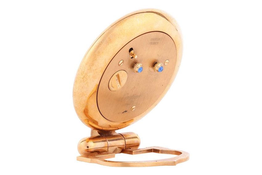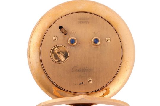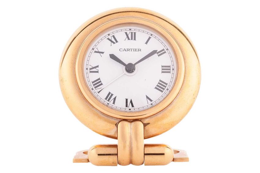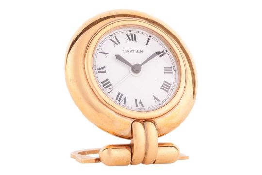Cartier – A ‘Must de Cartier’ Colisee Travelling Desk Clock, serial number 0539263, circa 1990, measuring 8.0cm x 9.5cm, with a white dial and black Roman numerals, quartz movement, with alarm, with box, no paperwork.