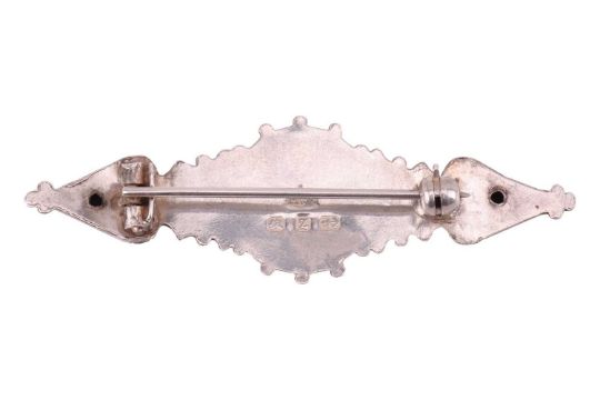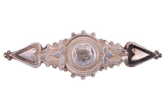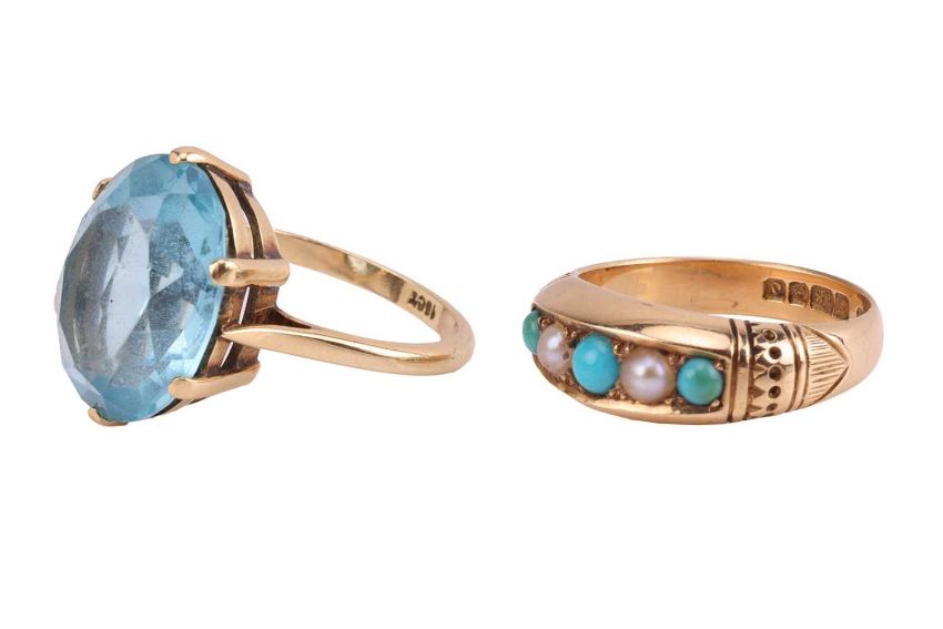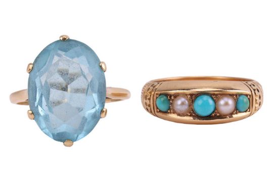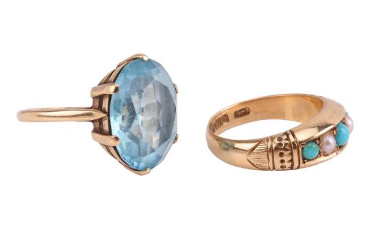 An Edwardian turquoise and split pearl half hoop ring in 18ct gold, alternating with round turquoise cabochons and split pearls, Birmingham 1902, size M; an oval-cut blue paste dress ring in yellow metal stamped '18ct', size O; and a Victorian silver brooch. (3)