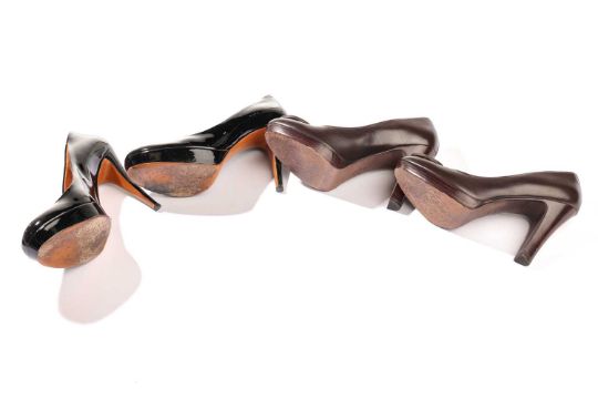 A pair of Gucci stilettos in black patent leather (size 39); and a pair of Tory Burch Betty pumps in brown leather (size 8M). (2)