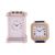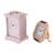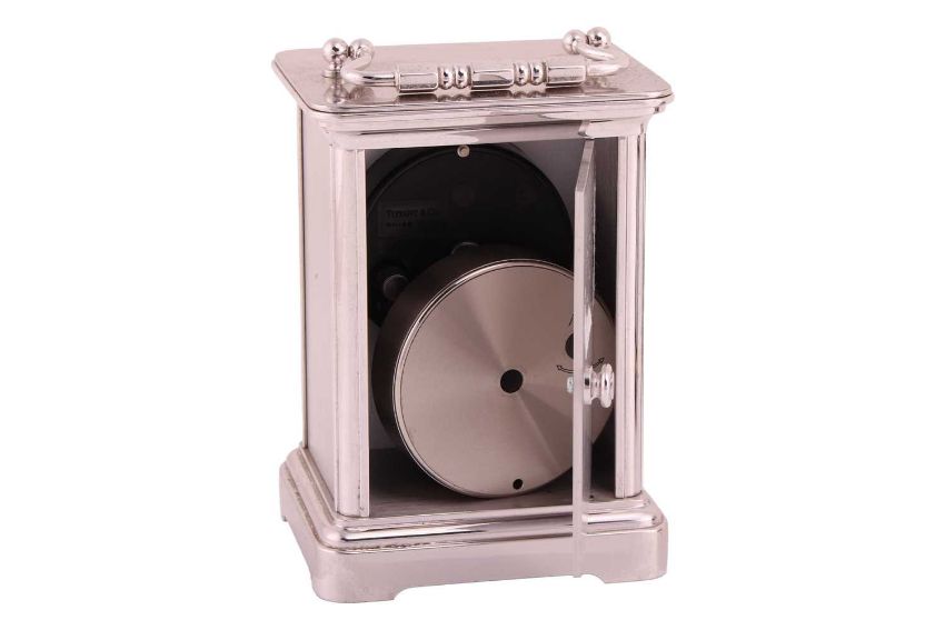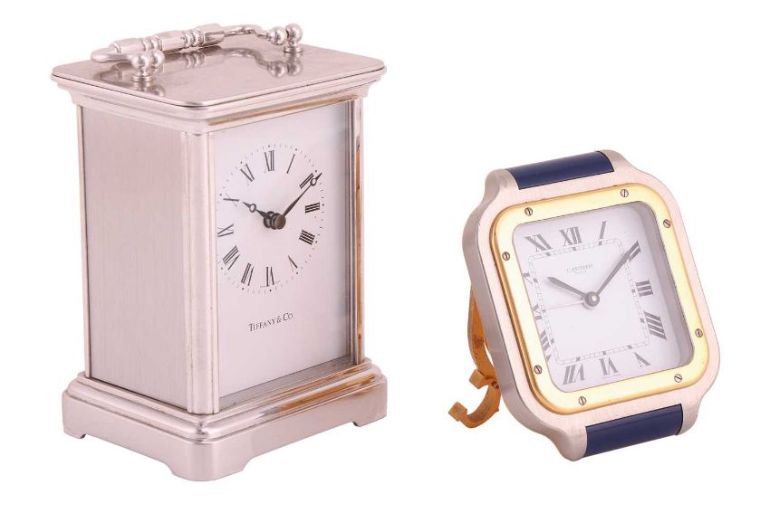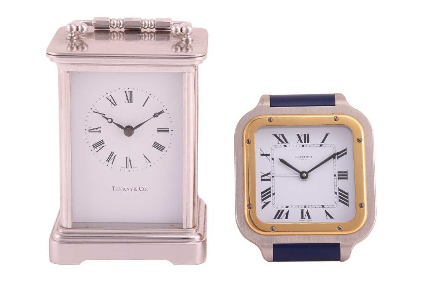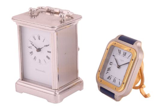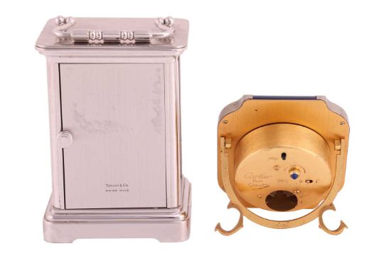 A Tiffany & Co carriage clock, with Roman numerals, quartz movement, in branded box with hinged handle, together with a Cartier desk clock, with Roman numerals, quartz movement, in gilt and enamel case. (2)