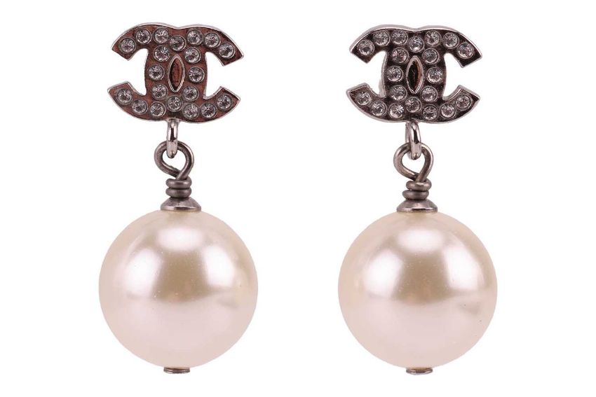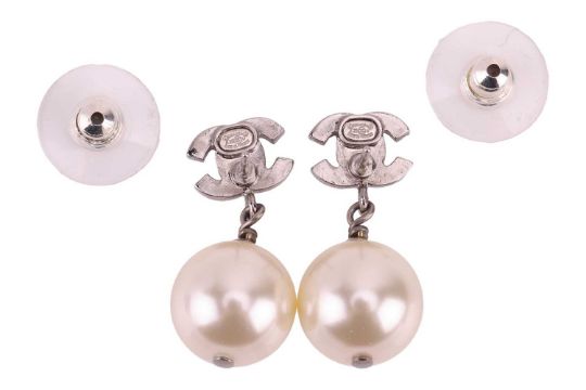 Chanel - a pair of drop earrings with CC logo set with paste, suspending a round faux pearl drop, signed and marked 'A25V' to the reverse with post fittings, 3.0 cm drop.