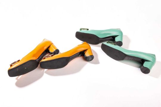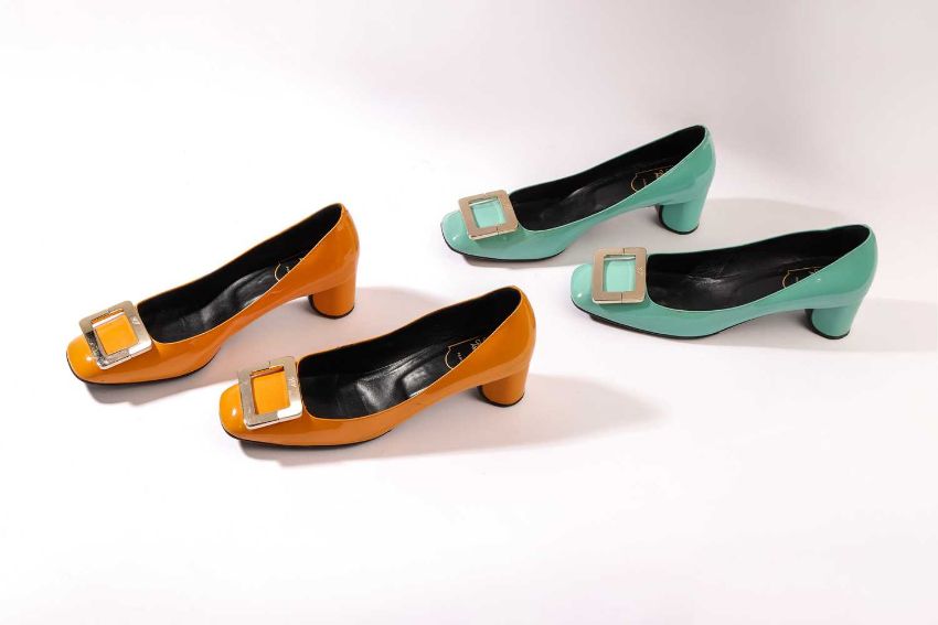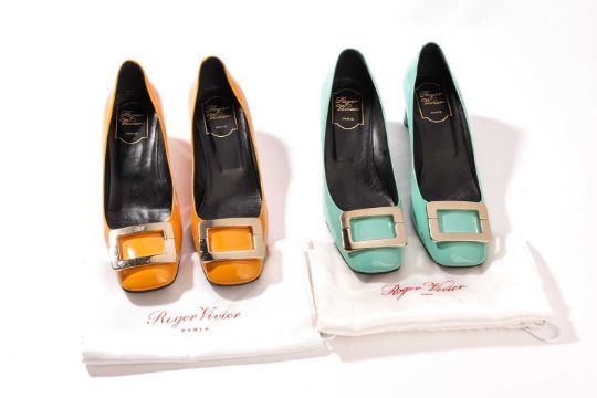 Roger Vivier - a pair of block heel pumps in aqua patent leather (size 39); another pair in orange patent leather (size 39). (2)