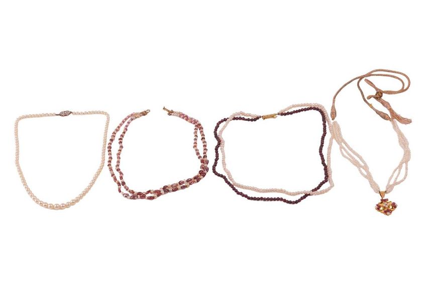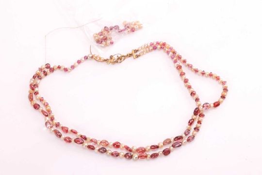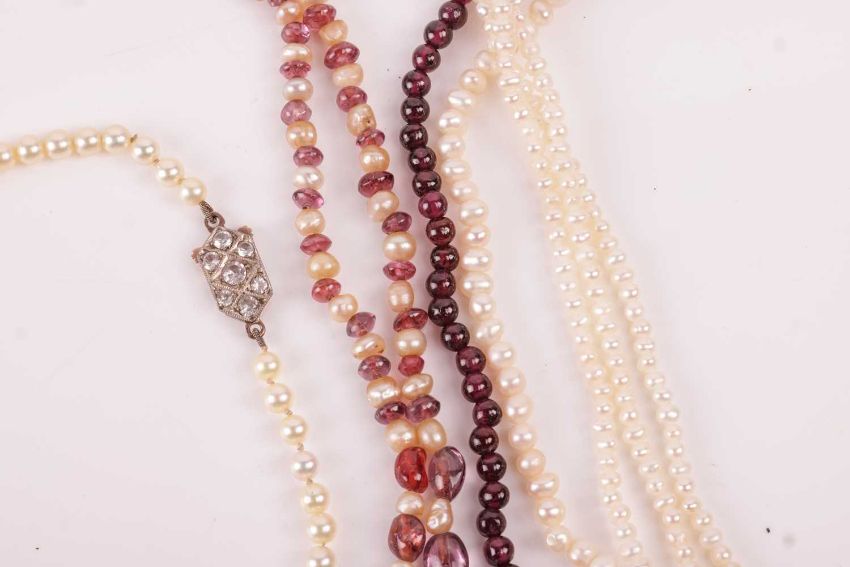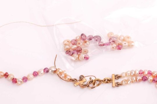Four beaded necklaces, including a cultured pearl and cord necklace leading to a ruby and pearl-set pendant, in yellow metal marked '22ct', together with a graduated cultured pearl necklace with a CZ-set clasp marked '9ct', and two other beaded necklaces. (4)
