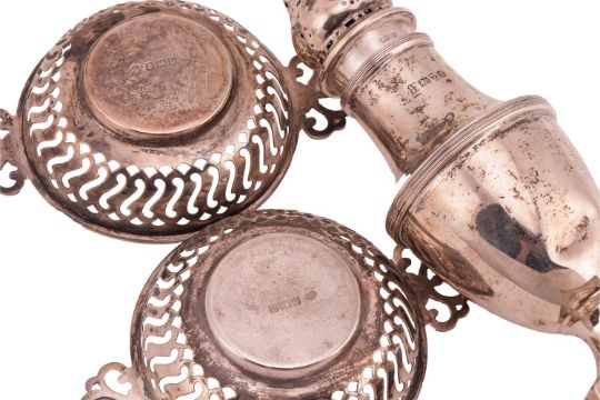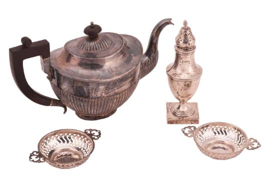 An Edwardian silver sugar sifter, of typical form on a square base, Chester 1907 by Barker Brothers, together with two small silver twin handled bowls, 12 cm wide, and an Indian white metal teapot of English design, unmarked, 197g (6.3 ozt.) of weighable silver.