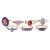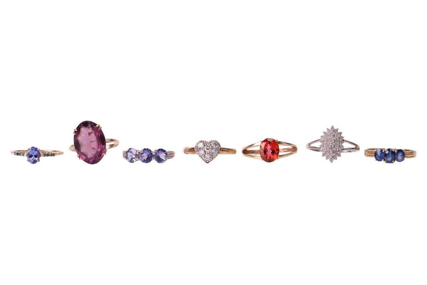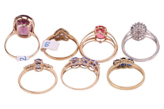 A group of seven gem-set rings; to include examples of a red mystic topaz ring between bifurcated shoulders in 9ct gold; a purple paste ring in 9ct gold; a sapphire three-stone ring in 9ct gold; two tanzanite dress rings both in 9ct gold; a heart cubic zirconia cluster ring in 9ct; and a synthetic diamond cluster ring in white metal testing as silver; ranging from size S to T; Total weighable 14.7 grams. (7)