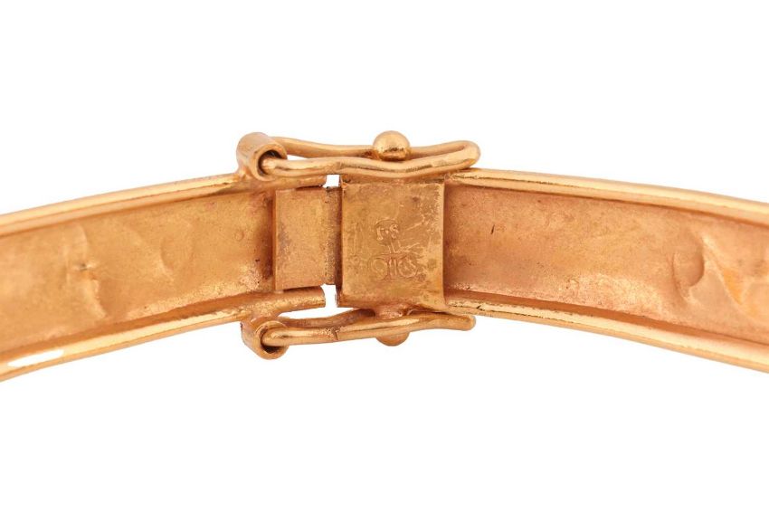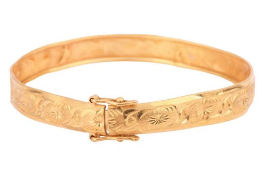 A bangle engraved with foliate design, the 8.1mm bangle featuring foliate and scroll engraving, completed with an integral box clasp and two additional safety catches, surface testing as high carat, the clasp marked ‘S.J’, inner diameter approximately 5.75cm, 8.6 grams.